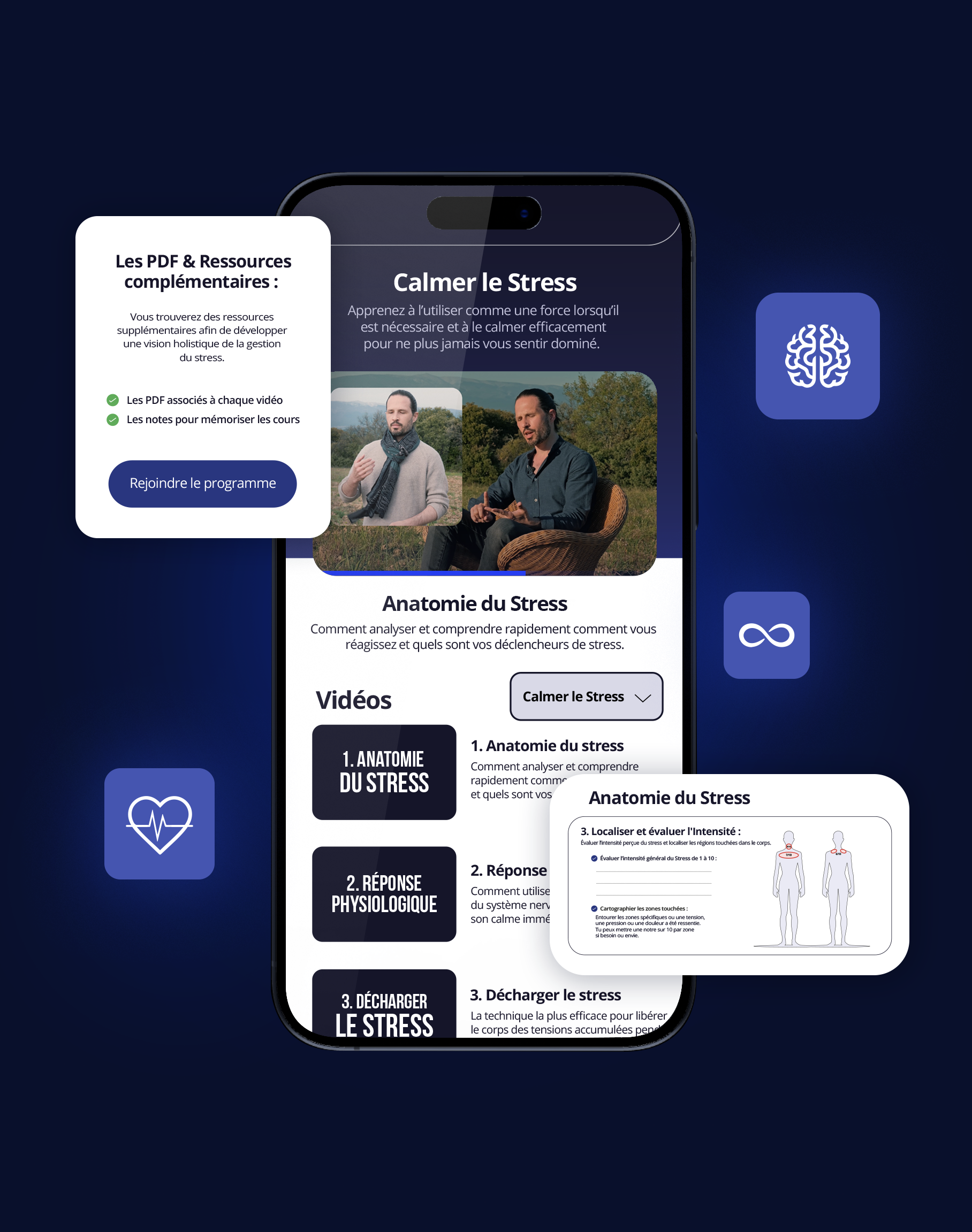 Le stress vous affecte sur le plan psychologique et physique. Alors, pour de le gérer efficacement, ce programme va vous enseigner comment garder le contrôle de votre corps, canaliser les éventuelles submersions émotionnelles et supprimer les déclencheurs psychologiques qui amplifient et maintiennent les tensions.